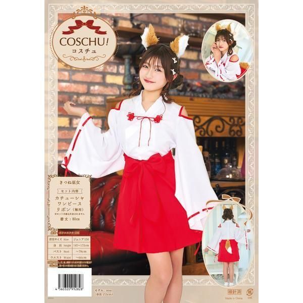 通常4〜7営業日後に出荷。メーカー在庫切れの場合納期最大2ヶ月。 ご注文前にお問い合わせいただけましたら納期確認いたします。 お気軽にお問い合わせください。 ジュニア向けコスチュームブランド「COSCHU!」。 リアルな狐耳と大きなしっぽが特徴のきつね巫女コスチューム。 肩のラインを美しく見せるオープンショルダーデザインがポイントです。 ワンピースタイプのため着脱がしやすく、コスチューム初心者にも扱いやすい仕様です。 狐耳のカチューシャは左右の位置を調整可能で、好みのバランスにアレンジできます。 妖怪モチーフや和風テイストの仮装、ハロウィン、撮影イベントなどさまざまなシーンで活躍します。 ●サイズ● 【ジュニア150】 ■対応サイズ 身長 145〜155cm、B 〜78cm、W 〜66cm ■実寸 B:90cm W:88cm 肩幅:34cm 袖丈:47cm 着丈:80cm ●セット内容● カチューシャ、ワンピース、リボン(袖用) ●素材● ポリエステル100% ●仕様● *開き:背中心ファスナー *裏地の有無:無し *洗濯不可、塩素系漂白剤による漂白不可、アイロンは中温で当て布使用、ドライクリーニング不可 *洗濯はお避け下さい。汚れは水で薄めた中性洗剤でタオル等を使って拭き取って下さい。アイロンは、当て布使用して下さい。 *生産時期やロット、デザインによって、多少サイズ・色・柄・仕様が異なる場合があります。 *摩擦や水濡れにより色移りする恐れがありますのでご注意ください。 *商品画像は可能な限り実物の色に近づくよう調整しておりますが、お使いのモニター設定、お部屋の照明等により実際の商品と色味が異なって見える場合がございます。又、同じ商品の画像でも、撮影環境によって画像の色に差異が生じる場合がございます。 ●モデル身長● 153cm/noa(モデル着用サイズ:150) ■おすすめオプション小物類■ 単品カチューシャやネコ耳などの小物類(1000円程度より多数販売中) ニーハイソックス、タイツなど(500円より多数販売中!) ■すぐに商品が欲しい!!という方■ 即日配達商品一覧がございますので、よろしければそちらをご覧下さいませ。 ■とにかく安くて高品質な商品が欲しい!という方■ 特別割引商品を掲載しています!最大80%引きの商品もあったりします! エアガン・迷彩服・ミリタリー装備品の通販ショップ ■ミリタリー初心者・女性大歓迎! 送料全国一律¥500! 決済方法いろいろ! ■ミリタリーコスプレの小物が必要な時は、コンバットアームズでお買い物♪ ■映画・アニメ・ゲームで有名な銃を¥1000〜取り揃えています! ★ミアカフェ・ミアリラではミアコス衣装を着用したイベントを実施中★ ★ミアグループのロリィタブランド デビュー★