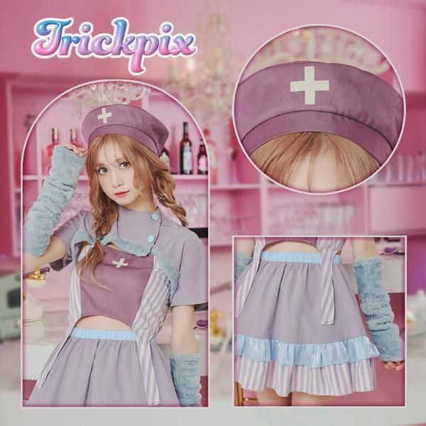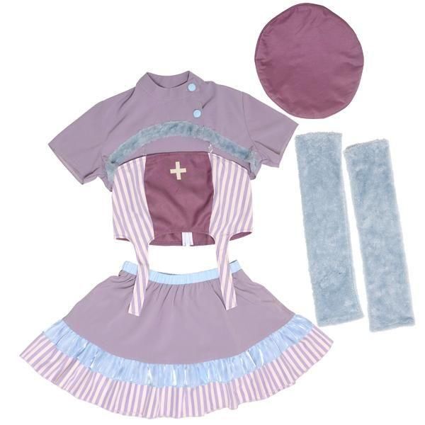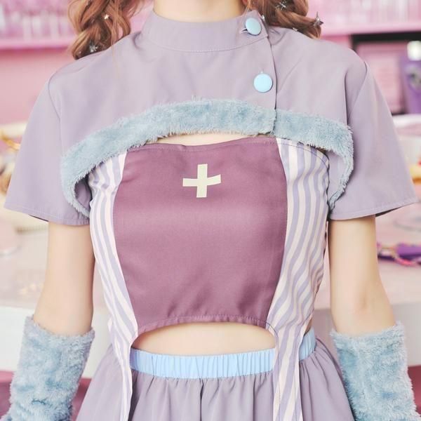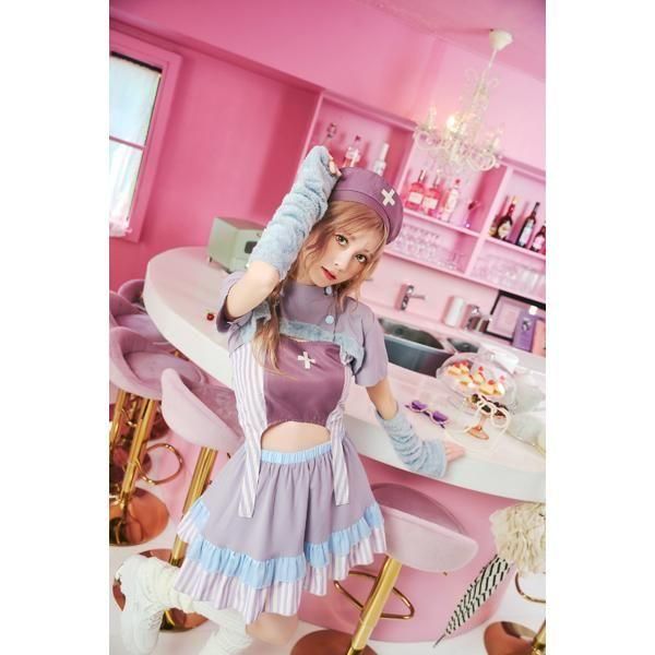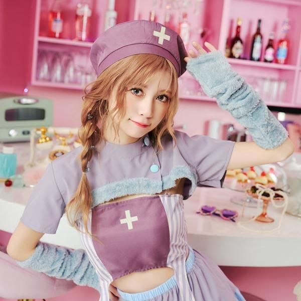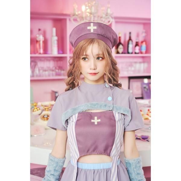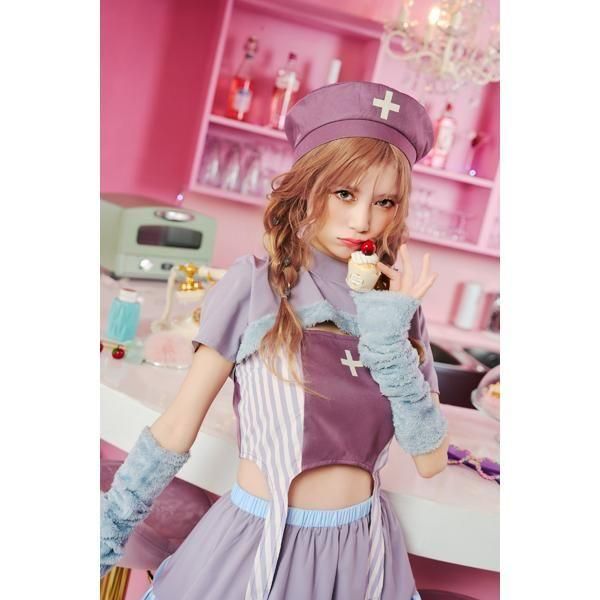 スモーキーなラベンダーカラーに、ピンクやブルーの配色を効かせたナース風のデザインが目を惹きます。