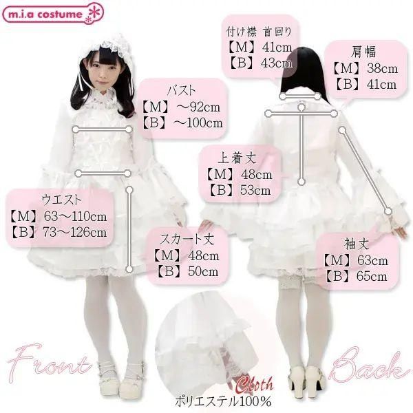 完全自社在庫商品。 2〜3営業日にて出荷 真っ白のワンピースとフリフリレースが可愛いロリータ服ができました☆ 別衿がついているのでより豪華に見えますよ♪ スカートのボリュームはかなりあって、どんな体制でもふわっとした感じが消えません。 リボンもこだわっていて、様々な真っ白なリボンが使われています。 ヘッドドレスもきちんとした作りになっているので、安心してお求めいただけます。 ●注意● 商品によって程度の違いがございますが、一部汚れがあるため、新品B品となります。 その他予期せぬ色移り等の汚れや不具合がある場合がございますので、ご了承ください。 返金・返品・交換等には一切応じることができません。ご納得の上ご購入願います。 ●サイズ● 【Mサイズ】 B:〜92cm W:63〜110cm 着丈:上着48cm、スカート48cm 肩幅:38cm 袖丈:63cm 首回り(付け襟):41cm 【BIGサイズ】 B:〜100cm W:73〜126cm 着丈:上着53cm、スカート50cm 肩幅:41cm 袖丈:65cm 首回り(付け襟):43cm ●セット内容● 上着、スカート、付け衿、ヘッドドレス ●素材● ポリエステル100% ●色● 色は写真と同じものになります。 ●仕様● *開き:上着/前ボタン スカート/ウエスト部分ゴム、スカート3枚仕立て、裏地付き、チュールパニエ付き 付け衿/ボタンにて着脱可 *水洗い不可、塩素系漂白剤による漂白不可、アイロンは中温で当て布使用、ドライクリーニング可 *色落ちの可能性があります。ご注意ください。 ●海外配送時計算重量● 705g 配送時計算重量は実際の商品の重さとは異なり、当社規定の海外配送時等の送料自動計算に使う重量となります。 ●モデル身長● みれい/159cm(Mサイズ着用) みれいちゃんがモデルのその他の商品 ・モデル所属 ●所属 ミアカフェ東京店 ミアリラ&フォト東京店 ●ミアコスの所属モデルと上記の店舗で会えちゃいます! ・所属店舗のモデルプロフィール みれいちゃんのミアカフェ・ミアリラ&フォト東京店共通のプロフィール ・出勤情報(モデルさんが出勤していれば会えるかも!?) ミアカフェ・ミアリラ&フォト東京店共通 (ミアカフェ東京店は出勤情報非公開です) ●上記モデルの撮影随時受付中!20分3000円より! ■商品封入用画像■ NH1016マリアドレスホワイト表面.jlb NH1016マリアドレスホワイト表面.pdf NH1016マリアドレスホワイト裏面.jlb NH1016マリアドレスホワイト裏面.pdf ■おすすめオプション小物類■ 単品カチューシャやネコ耳などの小物類(1000円程度より多数販売中) ニーハイソックス、タイツなど(500円より多数販売中!) ■すぐに商品が欲しい!!という方■ 即日配達商品一覧がございますので、よろしければそちらをご覧下さいませ。 ■とにかく安くて高品質な商品が欲しい!という方■ 特別割引商品を掲載しています!最大80%引きの商品もあったりします! エアガン・迷彩服・ミリタリー装備品の通販ショップ ■ミリタリー初心者・女性大歓迎! 送料全国一律¥500! 決済方法いろいろ! ■ミリタリーコスプレの小物が必要な時は、コンバットアームズでお買い物♪ ■映画・アニメ・ゲームで有名な銃を¥1000〜取り揃えています! ★ミアカフェ・ミアリラではミアコス衣装を着用したイベントを実施中★ ★ミアグループのロリィタブランド デビュー★